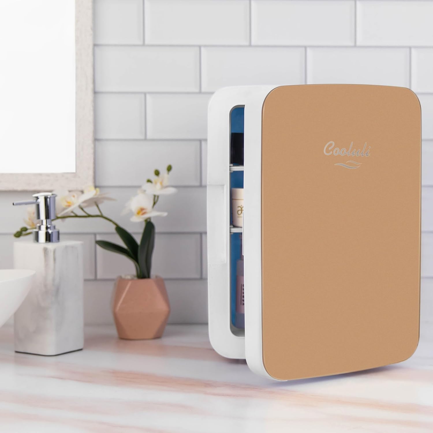 Cooluli 10L Mini Fridge for Bedroom - Car, Office Desk & College Dorm Room - 12v Portable Cooler & Warmer for Food, Drinks, Skincare, Beauty & Makeup - AC/DC Small Refrigerator with Glass Front, Gold