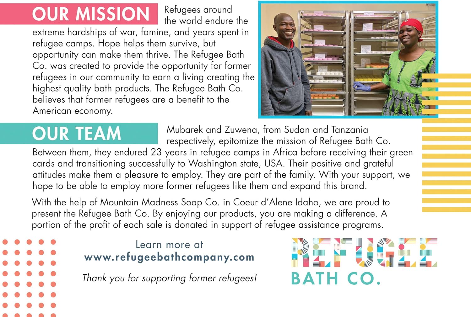 - REFUGEE MADE: Every box contains a "thank you card" explaining more about the individual who made your bath bombs. Each bath bomb is proudly hand-made in Washington State by refugees in our community. Our primary mission is to celebrate and welcome refugees in our community by providing employment.