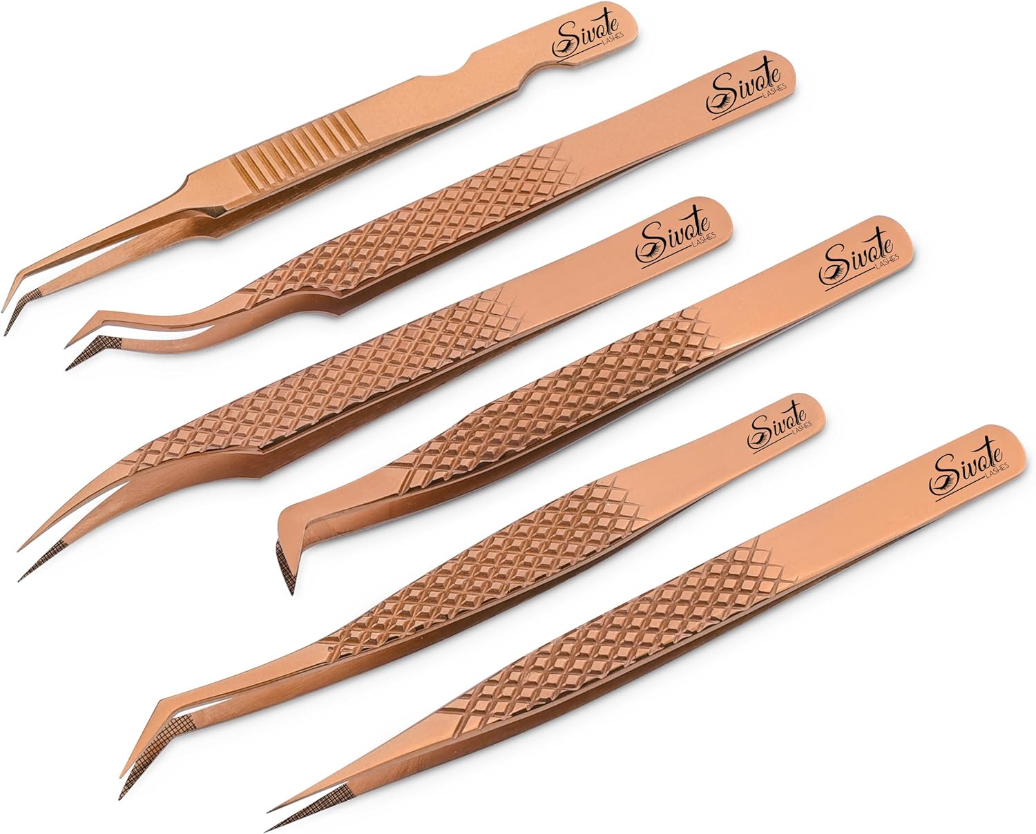 SIVOTE Eyelash Extension Tweezers Fiber Tips Japanese Steel, Set of 6 – Curved, Dolphin, 90° 45° Volume Boot & Slight Curved Tweezer – Professional Lash Tweezers for Lash Extensions Rose Gold