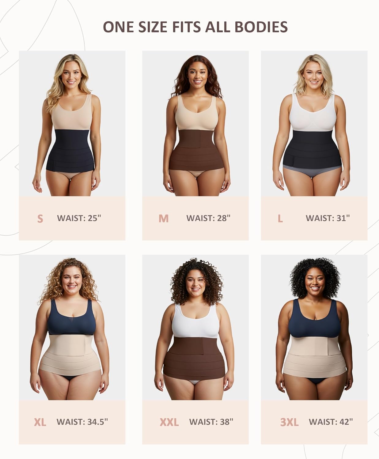 - One Size Fits All: Our waist wrap is designed to accommodate all body types with its one-size-fits-for all size within 23.5 IN-47.5 IN waistline. Measuring 157.2 IN in length and 4.92 IN in width, this bandage wrap offers versatility in snatching your waist, allowing you to adjust the tightness to your preference to your preference for ultimate comfort. Warm tips-Thinner women need to wrap more circles, will appear thick, full-figured women can wrap fewer laps and also have tummy coutrol.