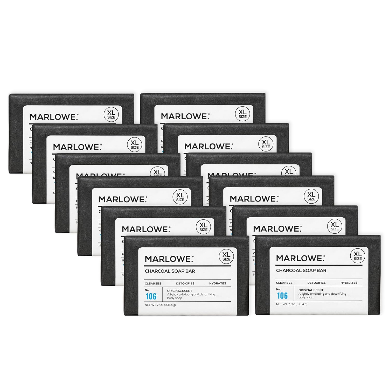 MARLOWE. No. 106 Charcoal Soap 7 oz (12 Bars) Body Bar Soap for Men, Cleansing, Purifying & Hydrating with Natural Extracts, Shea Butter, Olive Oil & Green Tea Extracts, Fresh Woodsy Scent