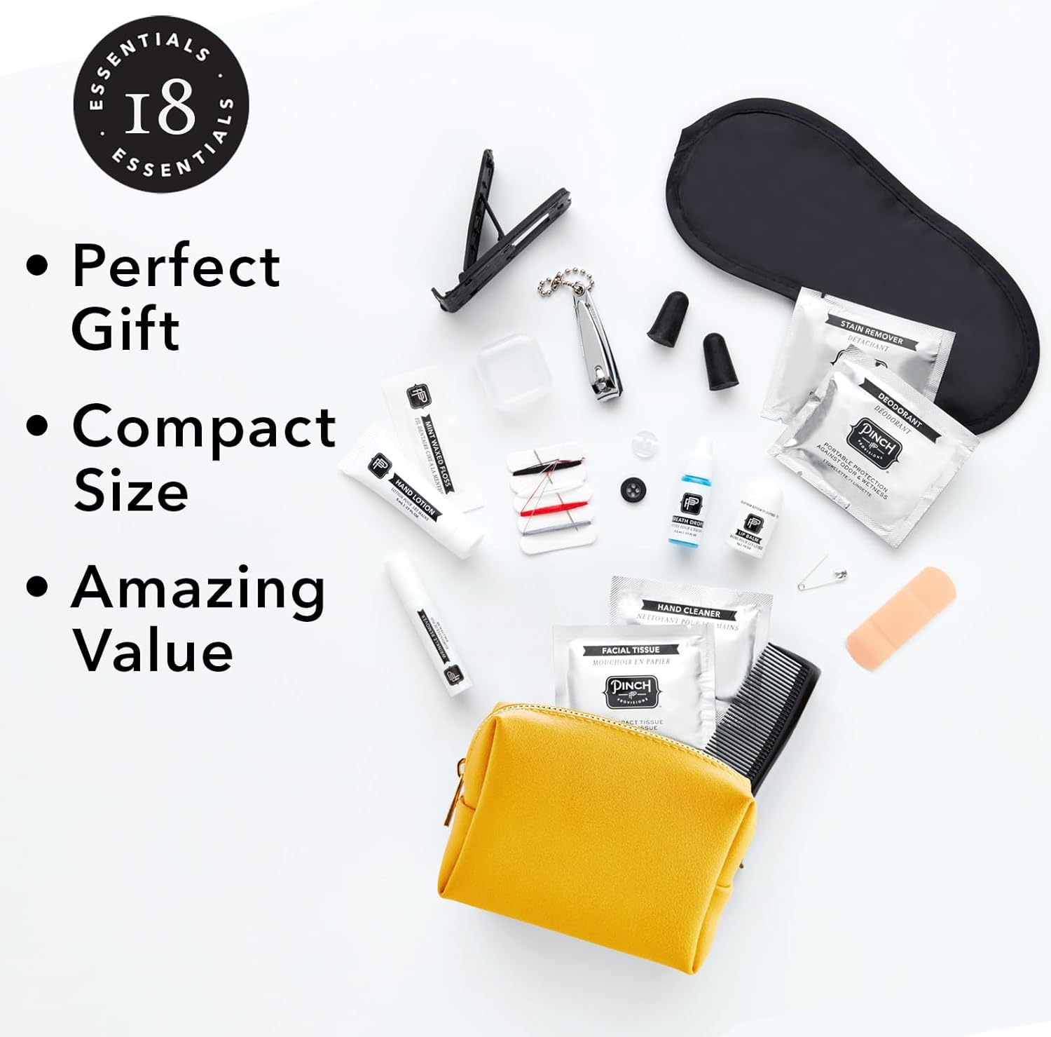 - ALL-IN-ONE TRAVEL ESSENTIALS - The kit comes with 18 travel-friendly things including a mending kit, a safety pin, an eye mask, nail clippers, a phone/tablet stand, facial tissues, and wrinkle remover - everything you need to make your journey comfortable