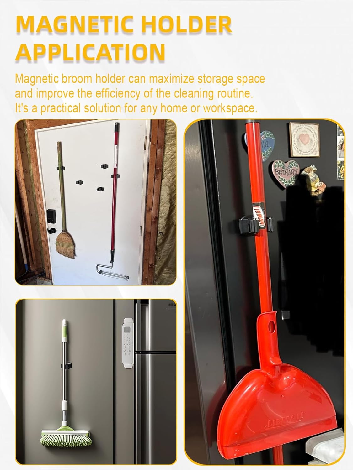 - Wide Applications: Mop holder magnetic is designed to hold various household objects to save space, perfect for hang brooms, mops, brushes, baseball bats, etc. Widely use in kitchen, laundry, garage, workshop and outdoors for all your organizing needs