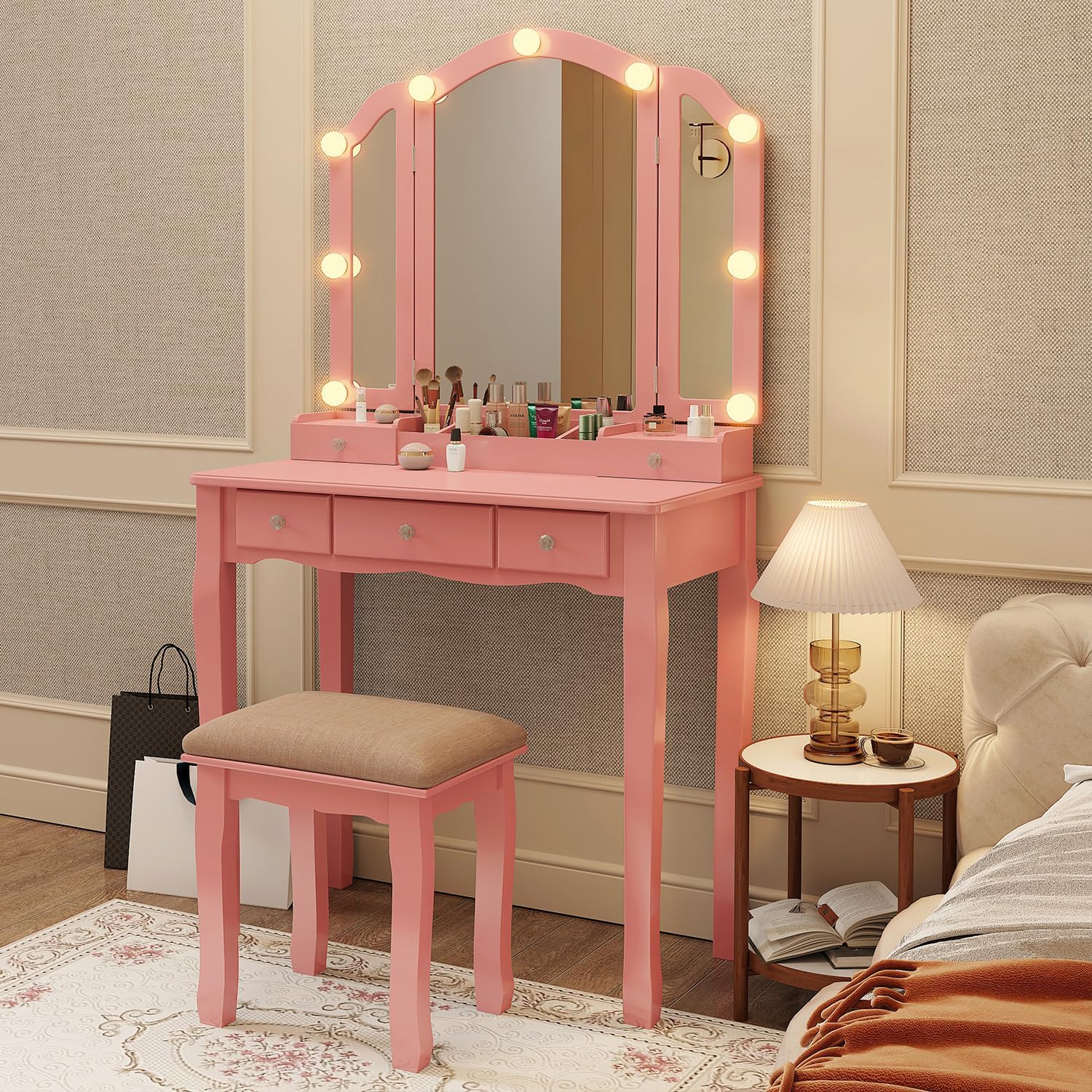 Vanity with Lights Girls Vanity Desk Set with Drawers Makeup Vanity Desk with Mirror and Lights Make Up Pink Makeup Vanity for Girls Table with Stool