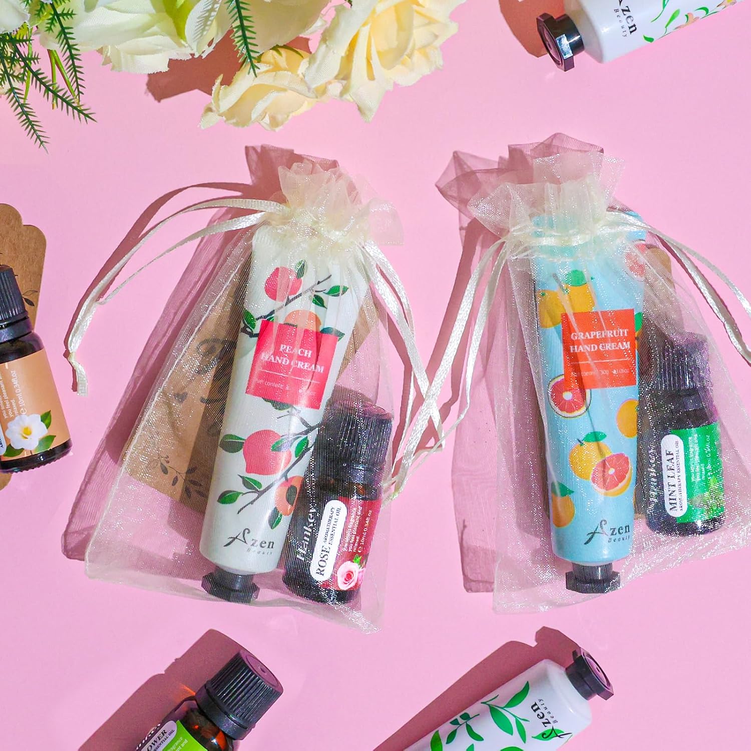 - Flavored Gift Sets: This set includes 30 hand creams, 30 essential oils, 30 white organza bags and 30 thank-you labels. The net content of each essential oil bottle is 10ml/0.34fl.oz which with 6 different scents - lavender, vanilla, peppermint, rose, white tea, lily. The net content of each hand cream is 1 ounces which with 6 different flavors - freesia, lily, peach, grapefruit, apple mango, green tea