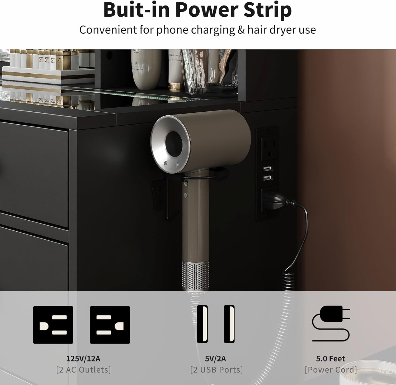 - Vanity Table with charging station: This Vanity comes with a hair dryer stand and charging station, including 2 standard plug sockets and 2 USB ports to connect your hair dryer, curling iron, computer, Ipad, mobile phone, allowing you to take beautiful selfies after applying makeup