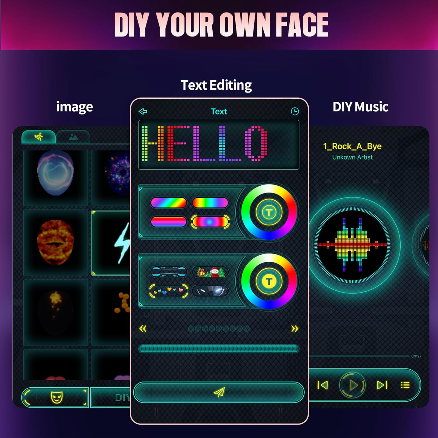 - [Custom Bluetooth Control] Take your facial experience to a whole new level! You can add photos or DIY scrolling text to this Halloween mask. If music is in the app or talking to the LED mask, the volume EQ on the mask will display on the mask. With so many preset images, animations and DIY features, this glowing is perfect for parties, Halloween, costume shows, music festivals, Christmas, dancing carnivals, masquerade costume, carnival, bar, it will make you the center of party