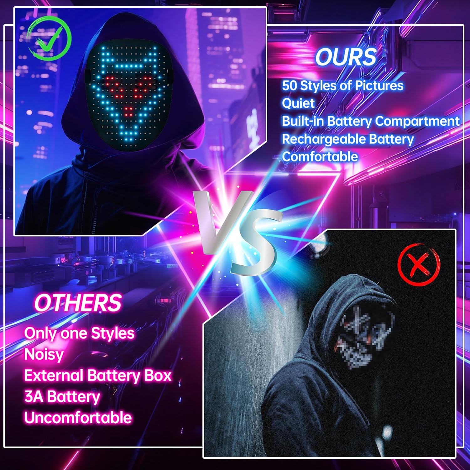 - [Comfortable to Wear]:Made sturdy plastic and soft sponge, you can wear this LED mask for a long time. Its ergonomic design, soft lining, and pre-cut eye holes ensure all-day comfort perfect for role-playing, masquerade balls, birthday parties, Halloween, Christmas, Carnival, electronic music festivals, etc.