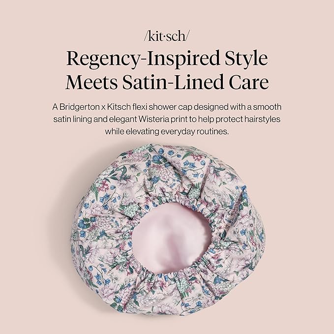 Bridgerton x Kitsch Satin-Lined Flexi Shower Caps for Women Reusable Waterproof - Large Wide Shower Cap for Women & Men, Adjustable, Stylish Hair Cap for Showers, For Long & Short Hair - Wisteria